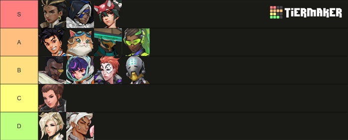 Sは特にマスター帯以上で強いキャラたちで、環境トップと言える。競技シーンでも常連。ただ付け加えるならソジョーンとトレーサーはAIMがないと全然活躍できないので、このふたりを初心者がメタル帯で出しても影響力は発揮できないと思った方がいい。